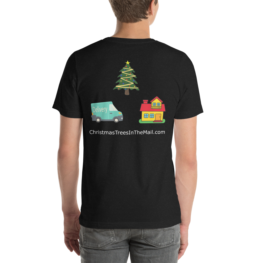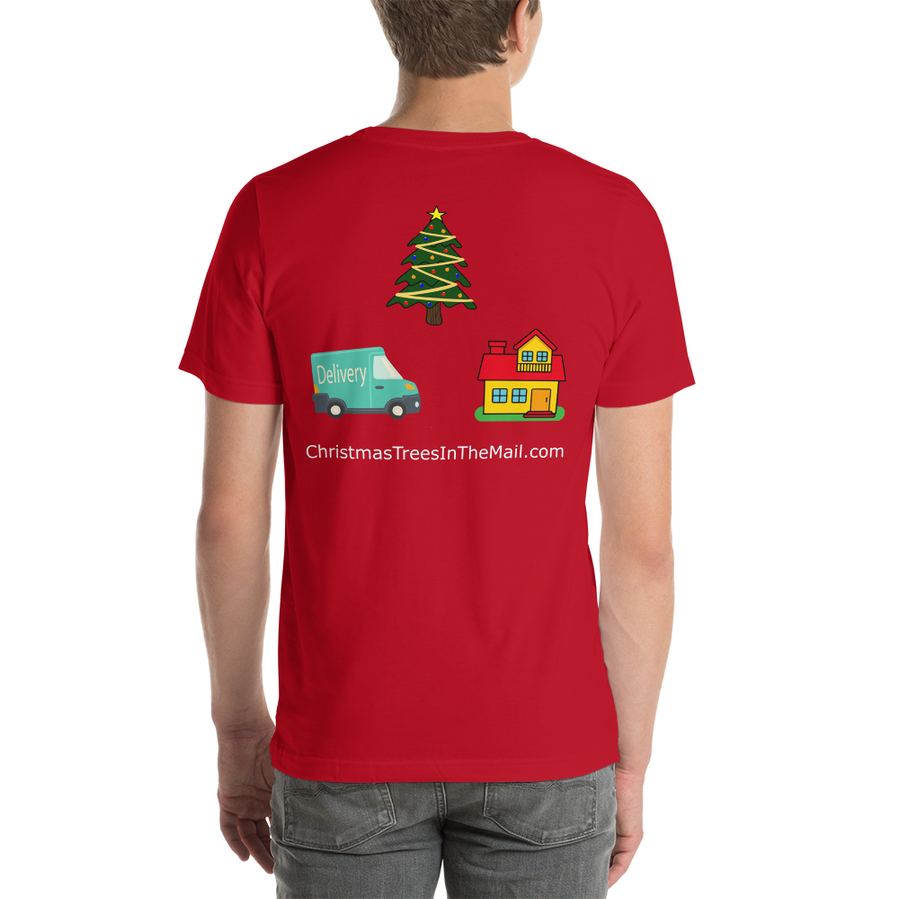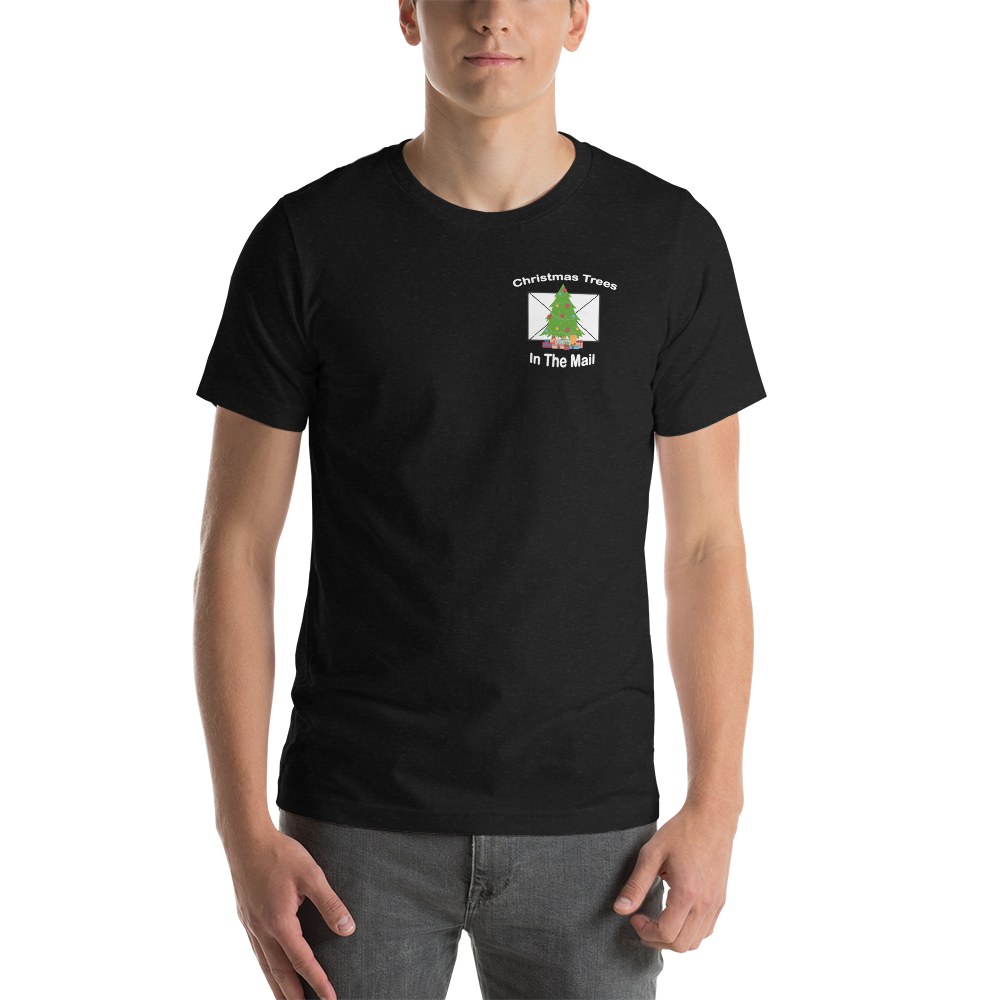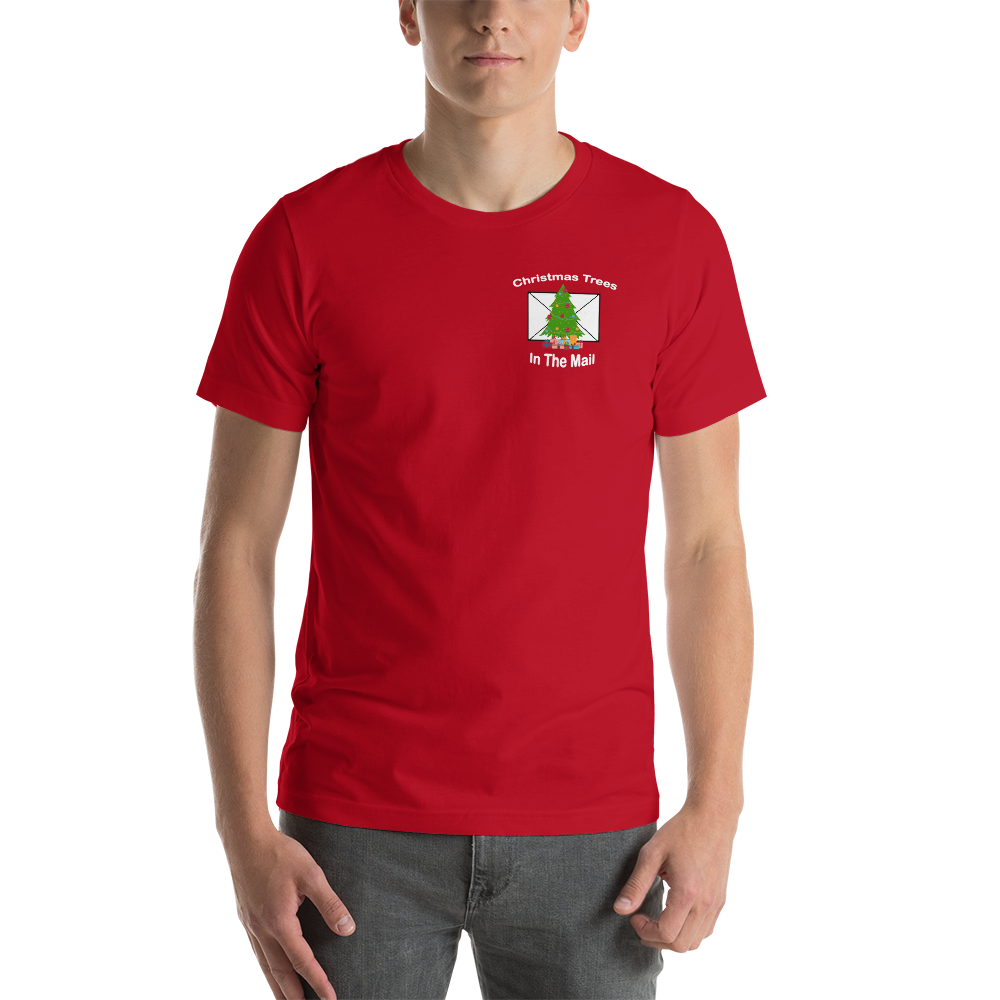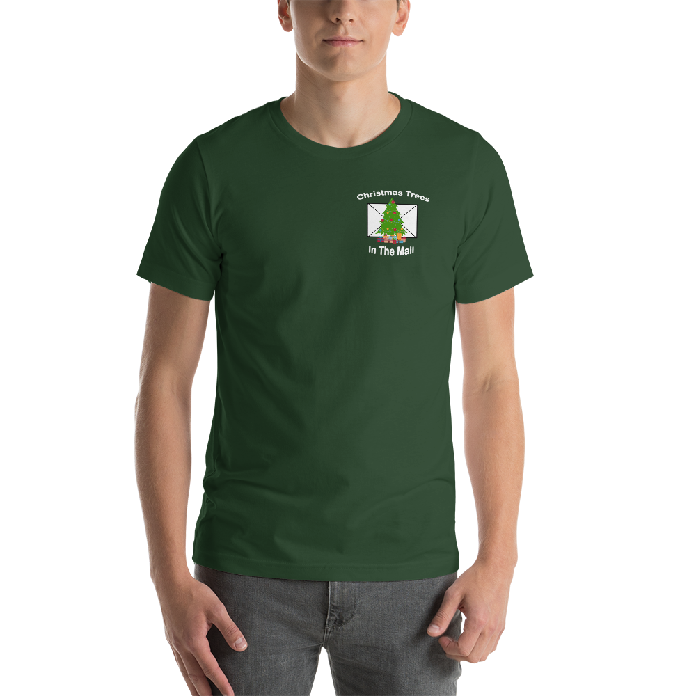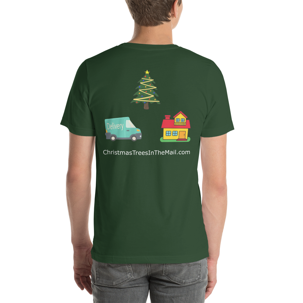 • Christmas Trees in the mail Logo printed on front and back of t shirt.