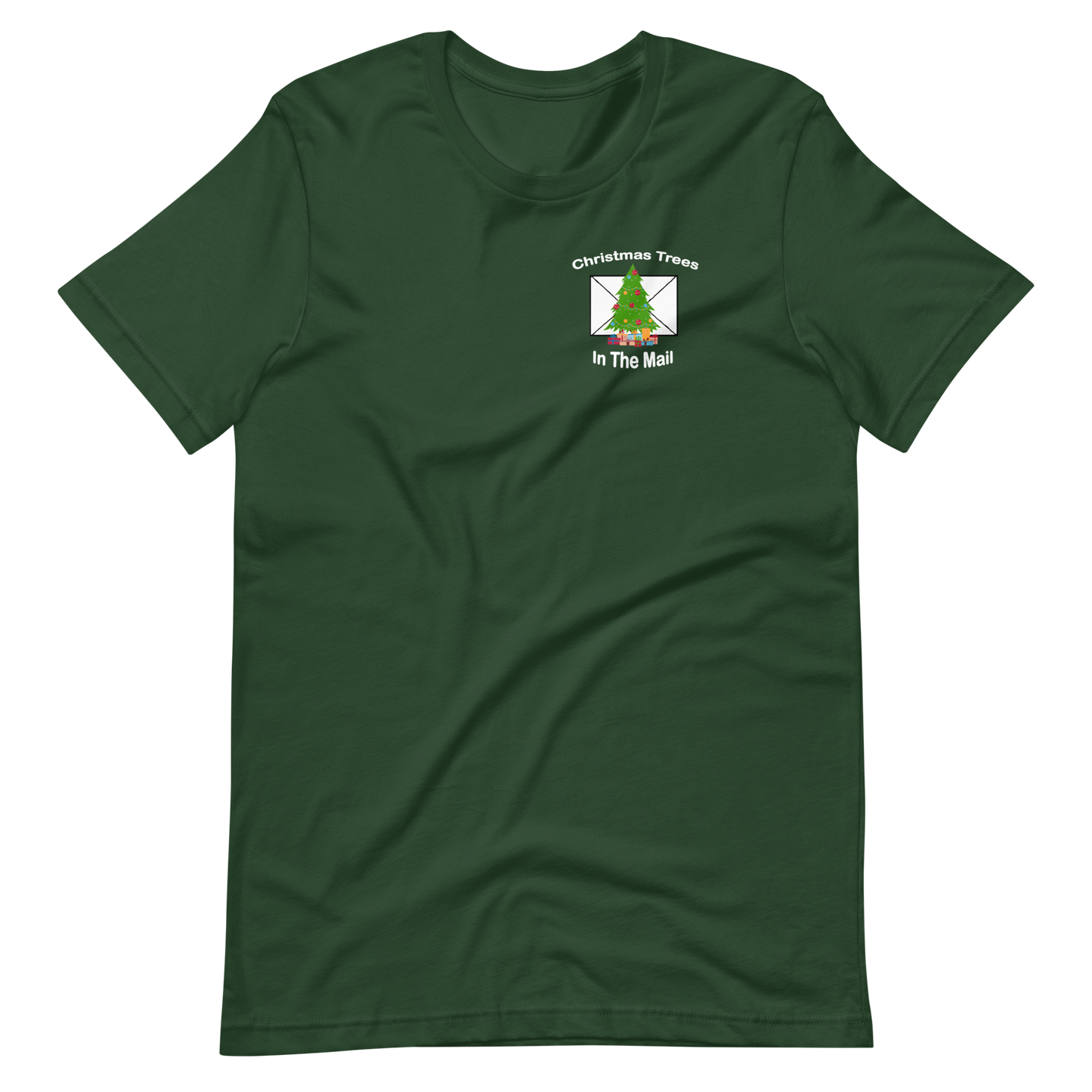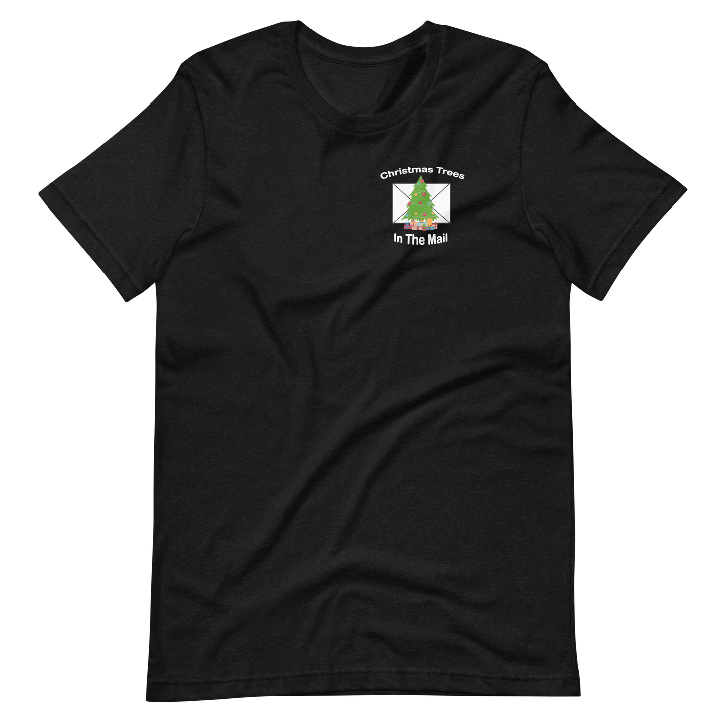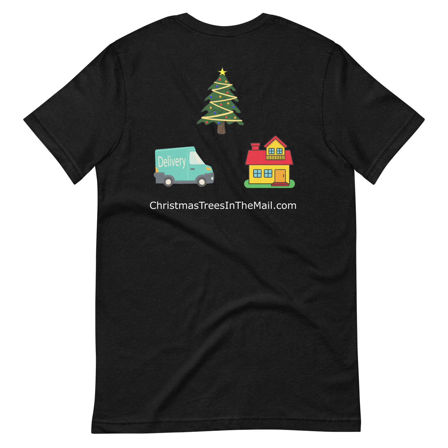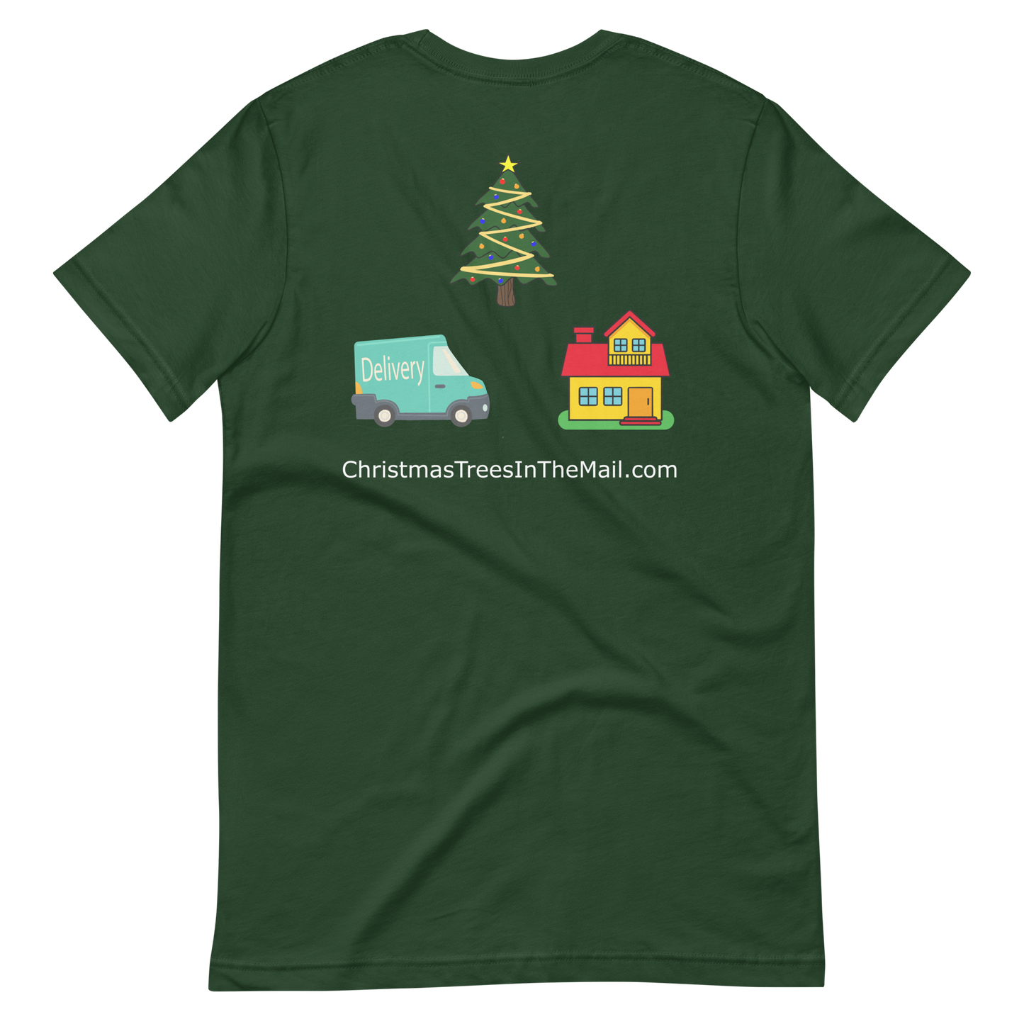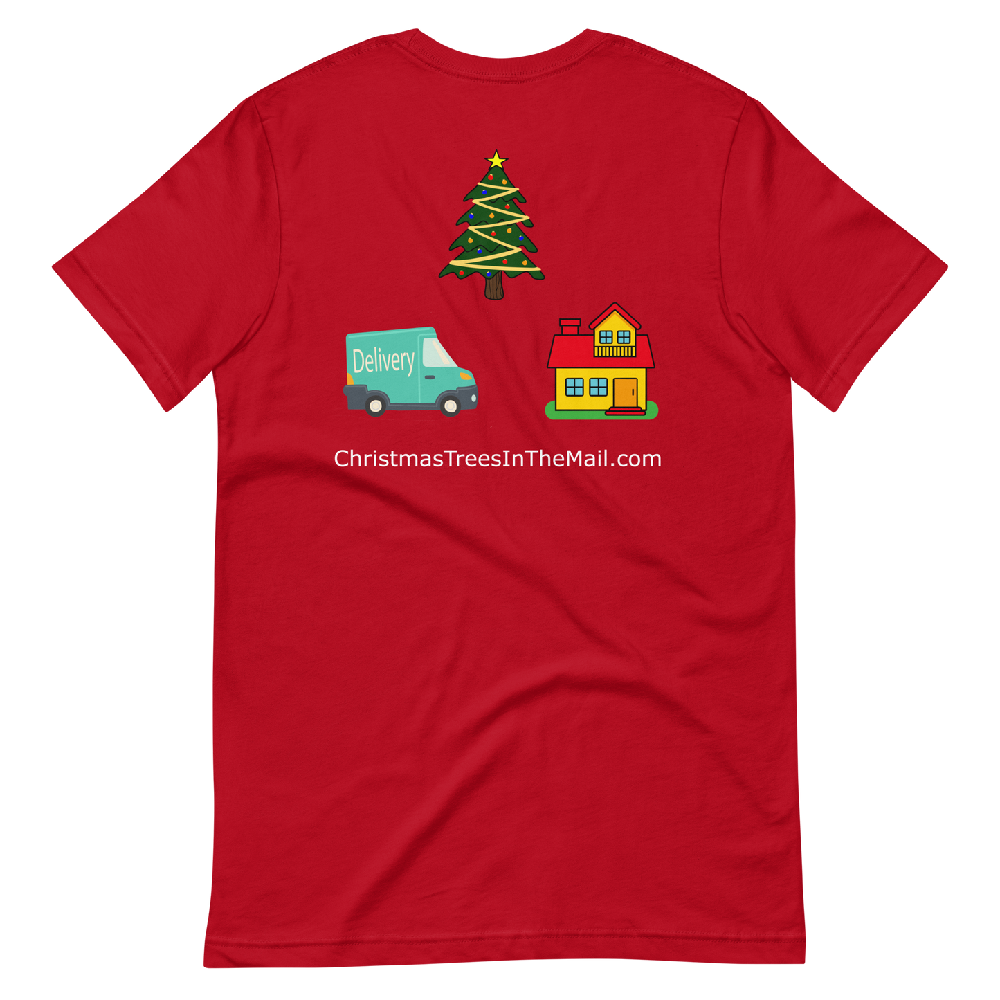 • Christmas Trees in the mail Logo printed on front and back of t shirt.